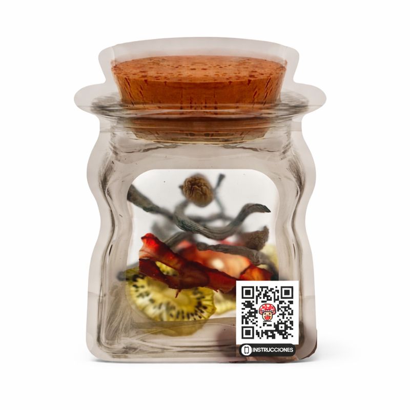 Nuestras tisanas están hechas con fruta deshidratada natural (piña, manzana, jamaica, canela o mezcla de temporada) e infusionadas con una dosis precisa de hongo Pearl Gates, una cepa selecta de Psilocybe cubensis conocida por su energía suave pero poderosa, ideal para abrir espacios de introspección profunda y conexión emocional.